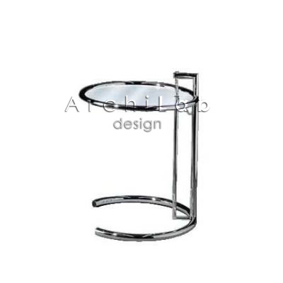 Designed in 1927 by Eileen Gray. This table was designed by Eileen Gray as a bedside "breakfast table" for the guest room of E 1027, the villa which she designed with Jean Badovici at Roquebrunein 1927. Badovici, a roumanian intellectual, was a friend of Le Corbusier and apparently the person more responsible for convincing Eileen Gray to turn to architecture. He was editor of "l' Architecture Vivante" which published a special number on the house at Roquebrune entitled "E 1027 Maison en Bord de Mer". The name E 1027 was a cryptogram containing the initials of the two designers. The E was for Eileen. The numbers 10, 2 and 7 stood for the letters of the alphabet, J, B and G.